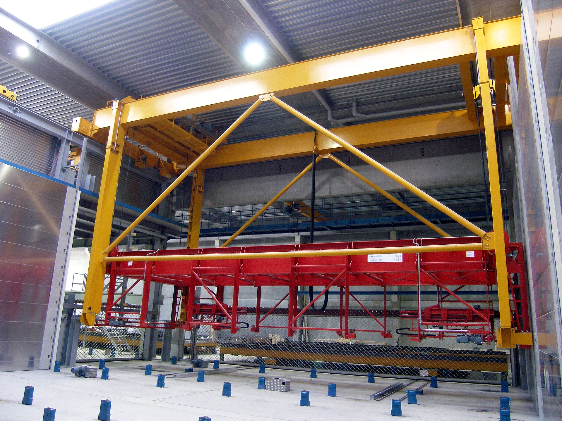 Urządzenie do obsługi regału z komorami do twardnienia betonu