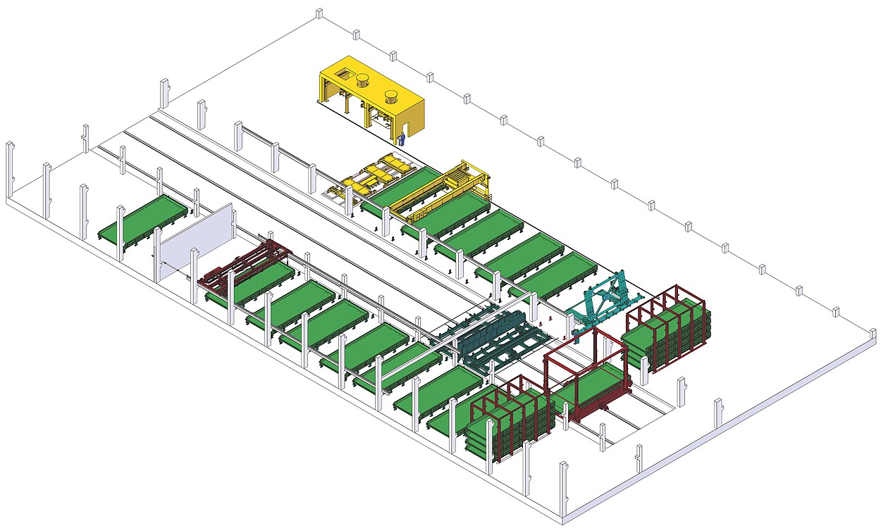 Концепция установки основана на производстве за одним столом с гибкими и специализированными рабочими станциями. Центральная передвижная платформа с двумя местами для принятия поддонов - главная особенность гибкого производства. Она используется для обеспечения всех транспортных операций. Поддерживается за счет дополнительных машин - бетонораздатчика, вибрационного уплотнителя, бетоноотделочного устройства и станции опрокидывания, для рентабельного производства сложных бетонных элементов.
