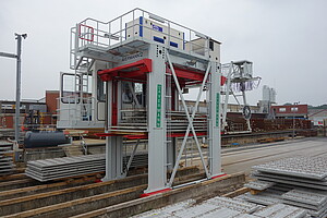 使用构件装载架配合载重汽车来装载的全自动化堆场系统。生产好的构件被从车间运送至堆场存放,并按照任务要求装载到相应的载重汽车上。